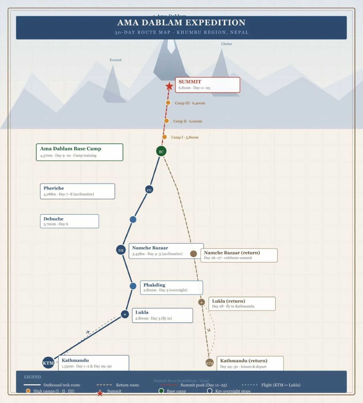 Summit 8000 is a Sherpa-owned expedition company based in Kathmandu with over a decade of guided climbs in the Khumbu region. Every expedition we run on Ama Dablam is led by Sherpas who have personally summited the peak multiple times and know the Southwest Ridge in every season and weather condition.