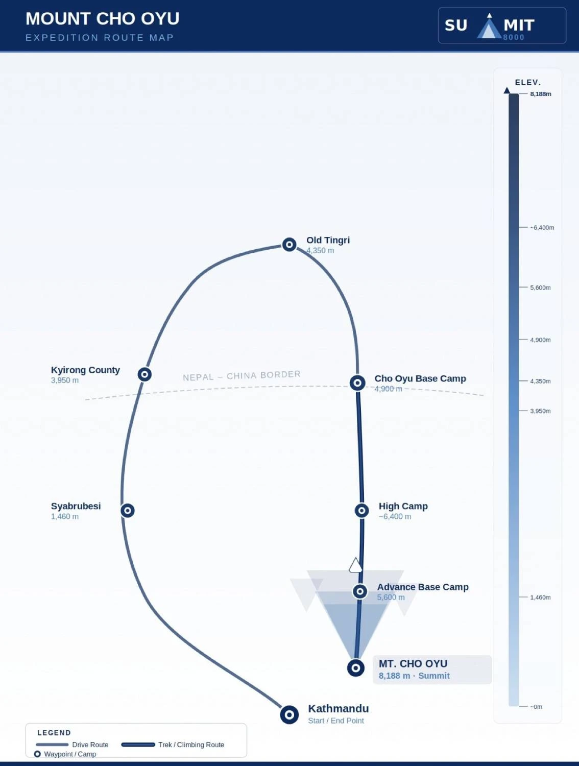 Cho Oyu is located on the Nepal–Tibet border in the Mahalangur Himal range. With an elevation of 8,188 meters, it is the sixth-highest mountain in the world and one of the most popular 8,000-meter peaks due to its relatively less technical climbing route.
